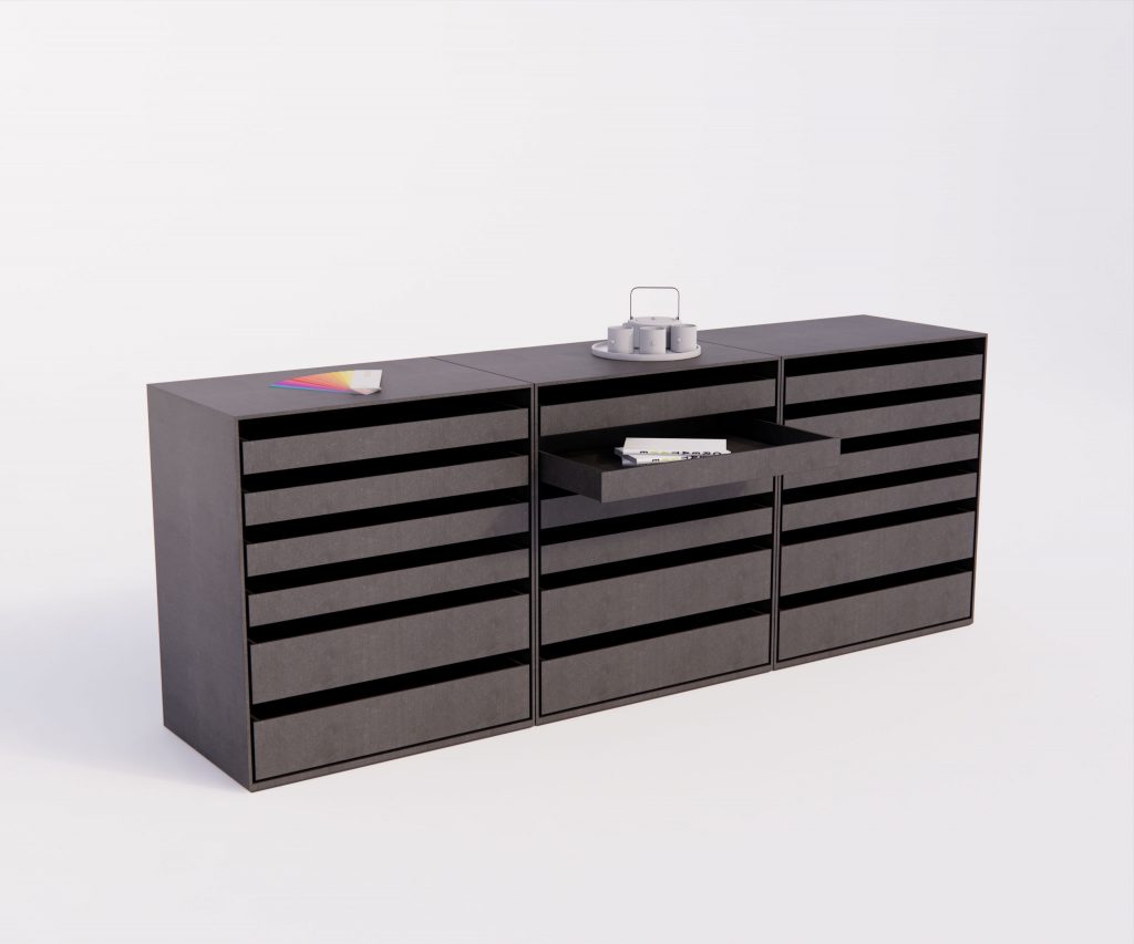 Beyond black, DEBO® UltraCore is available in a variety of through-dyed colors. Wood fibers are infused with organic dyes during production, giving the panels rich, uniform color throughout. This eliminates the need for edge banding and allows for clean, exposed edges.